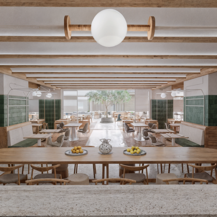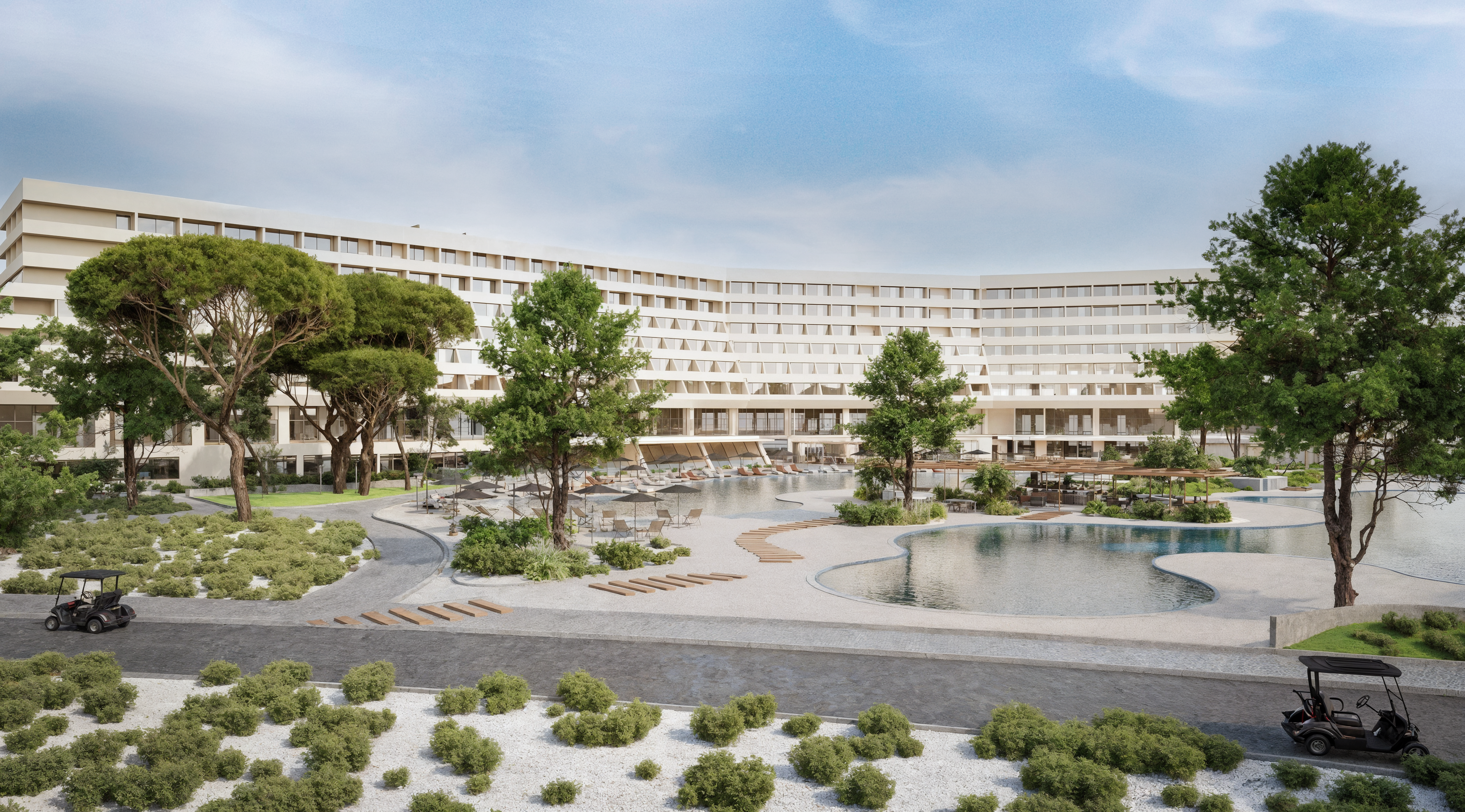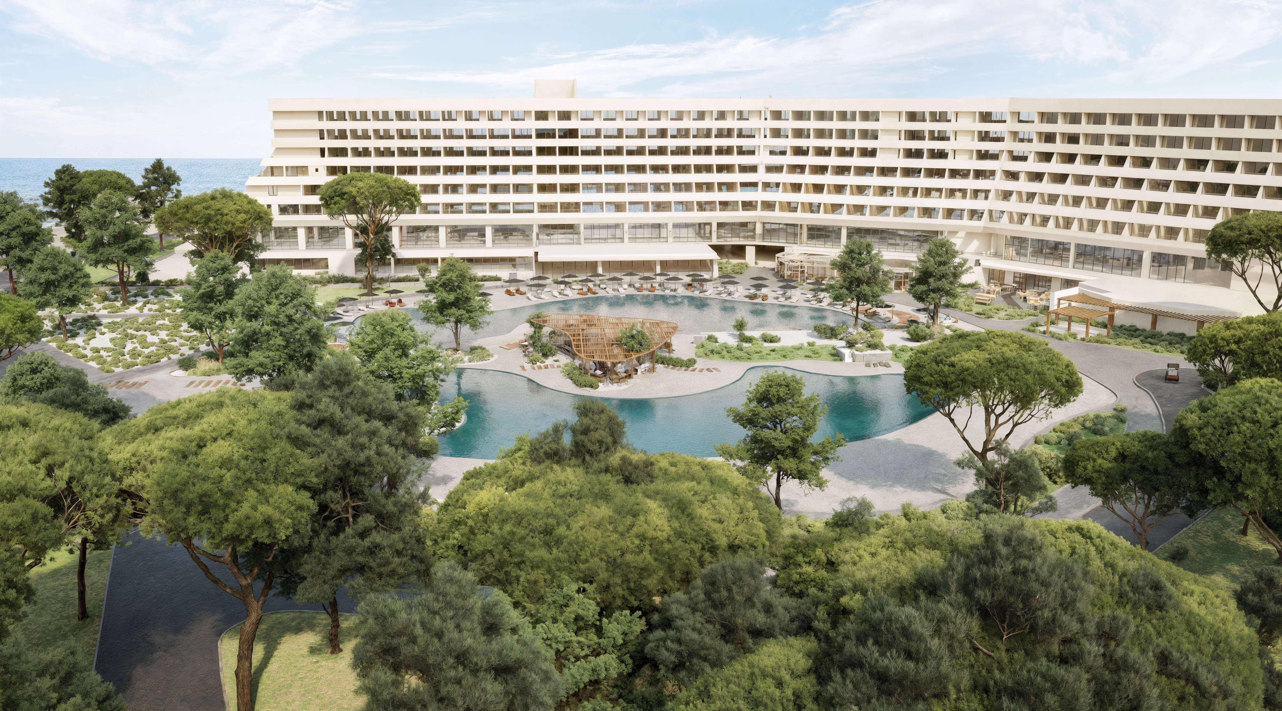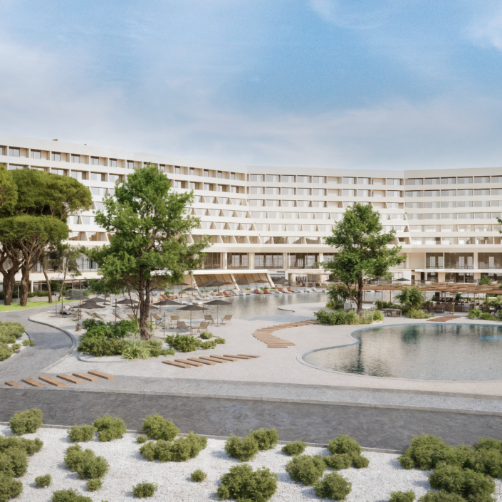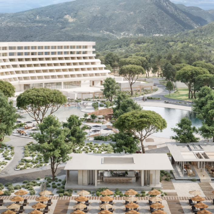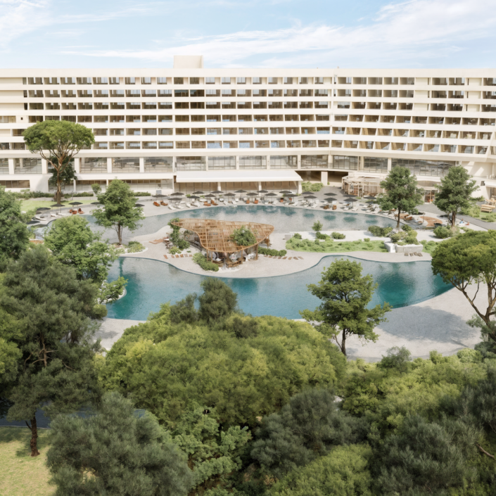 This project addresses the renovation of the Sithonia building, one of the two central and iconic building structures of the historic Porto Carras resort in Chalkidiki. The design intention was to reinvigorate the spaces, in order to meet the expectations, demands and needs of the contemporary traveler, while maintaining the building’s modernist and geometric identity. In the process of converting the building into a high-end 5* family hotel, the redesign of the outdoor spaces with a masterplan was key. The hotel is comprised of 8 floors in total. The first two host the premium suites and the common areas including the lobby, 4 restaurants, 1 bar, a kids’ club, a gym, a spa and 3 retail units. The rest of the floors are comprised entirely of rooms. Two large lagoon pools and the beach area are the main poles of the masterplan and are accompanied by a pool bar, a beach bar and a seaside restaurant.