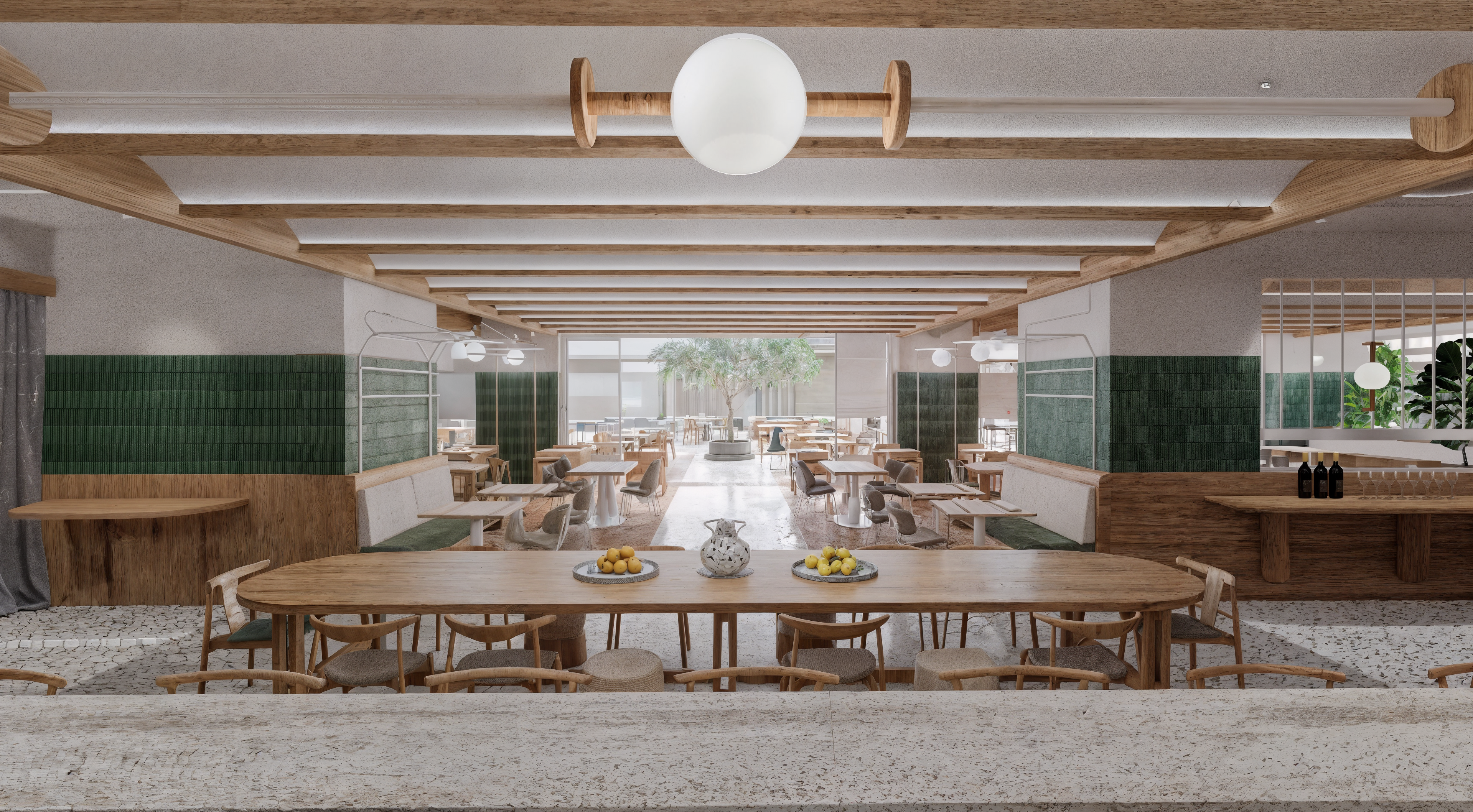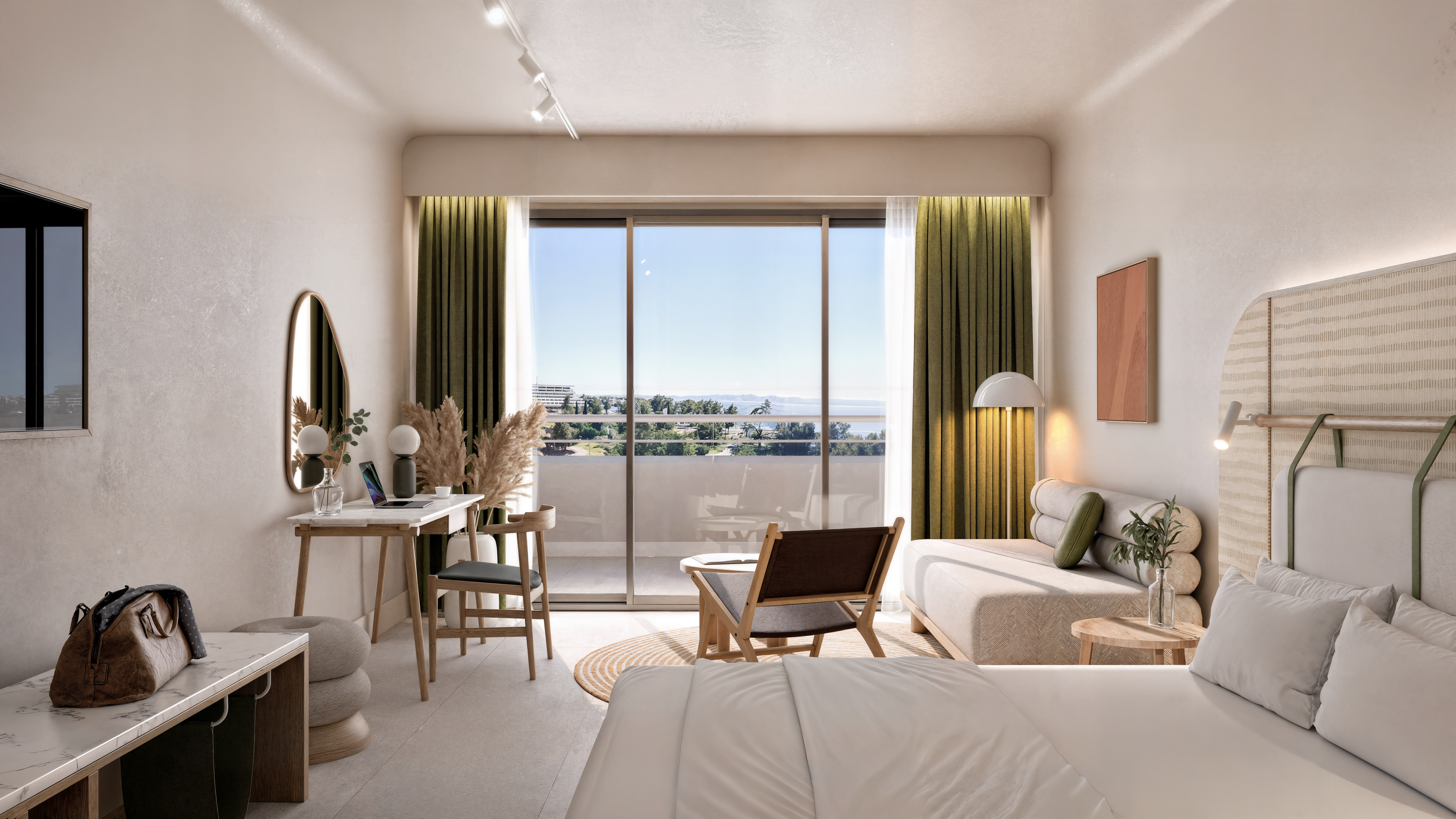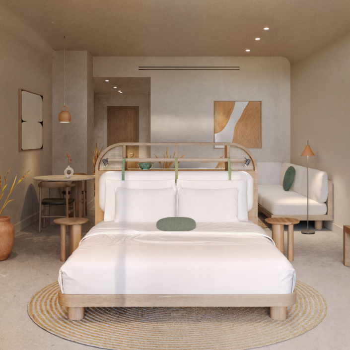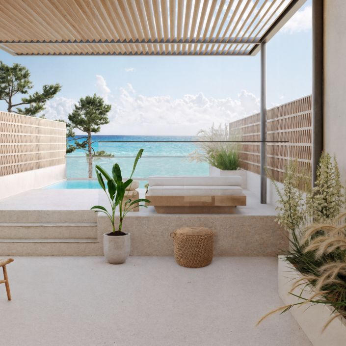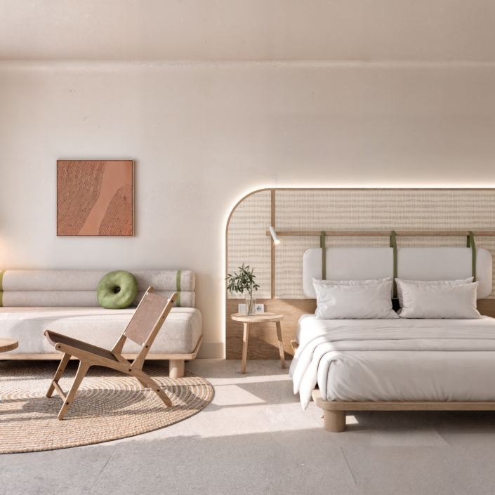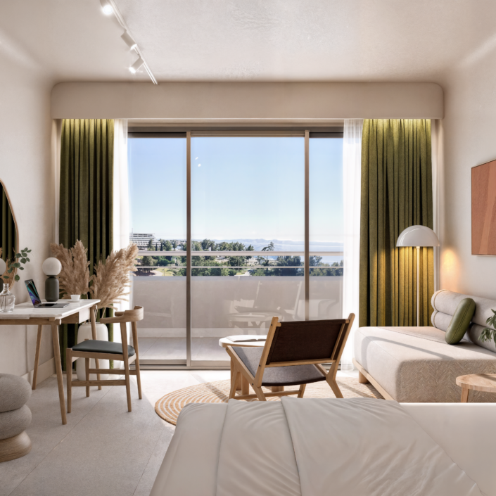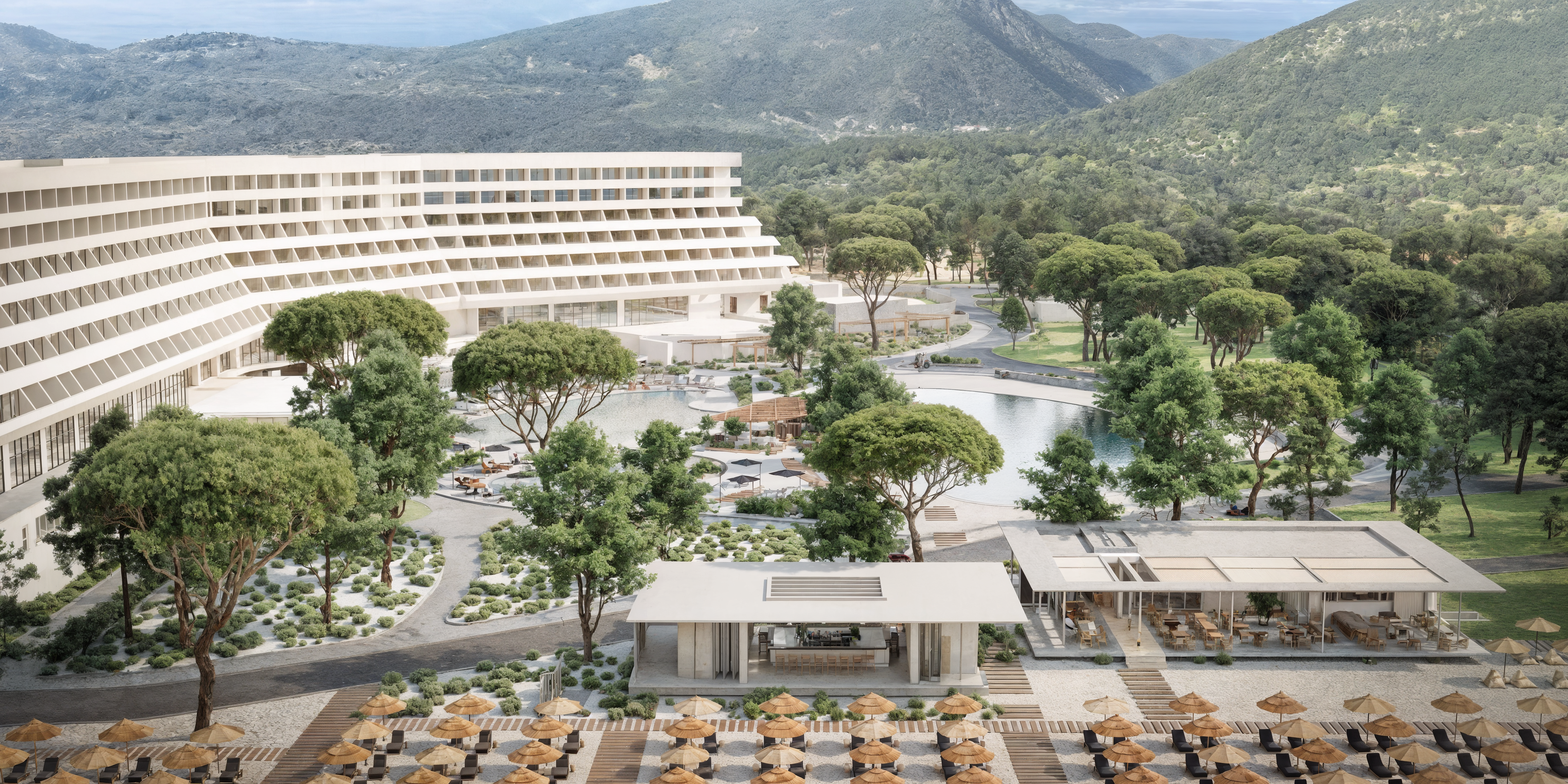 This project addresses the renovation of the Sithonia building, one of the two central and iconic building structures of the historic Porto Carras resort in Chalkidiki. The design intention was to reinvigorate the spaces, in order to meet the expectations, demands and needs of the contemporary traveler, while maintaining the building’s modernist and geometric identity. In the process of converting the building into a high-end 5* family hotel, the redesign of the outdoor spaces with a masterplan was key. The hotel is comprised of 8 floors in total. The first two host the premium suites and the common areas including the lobby, 4 restaurants, 1 bar, a kids’ club, a gym, a spa and 3 retail units. The rest of the floors are comprised entirely of rooms. Two large lagoon pools and the beach area are the main poles of the masterplan and are accompanied by a pool bar, a beach bar and a seaside restaurant.