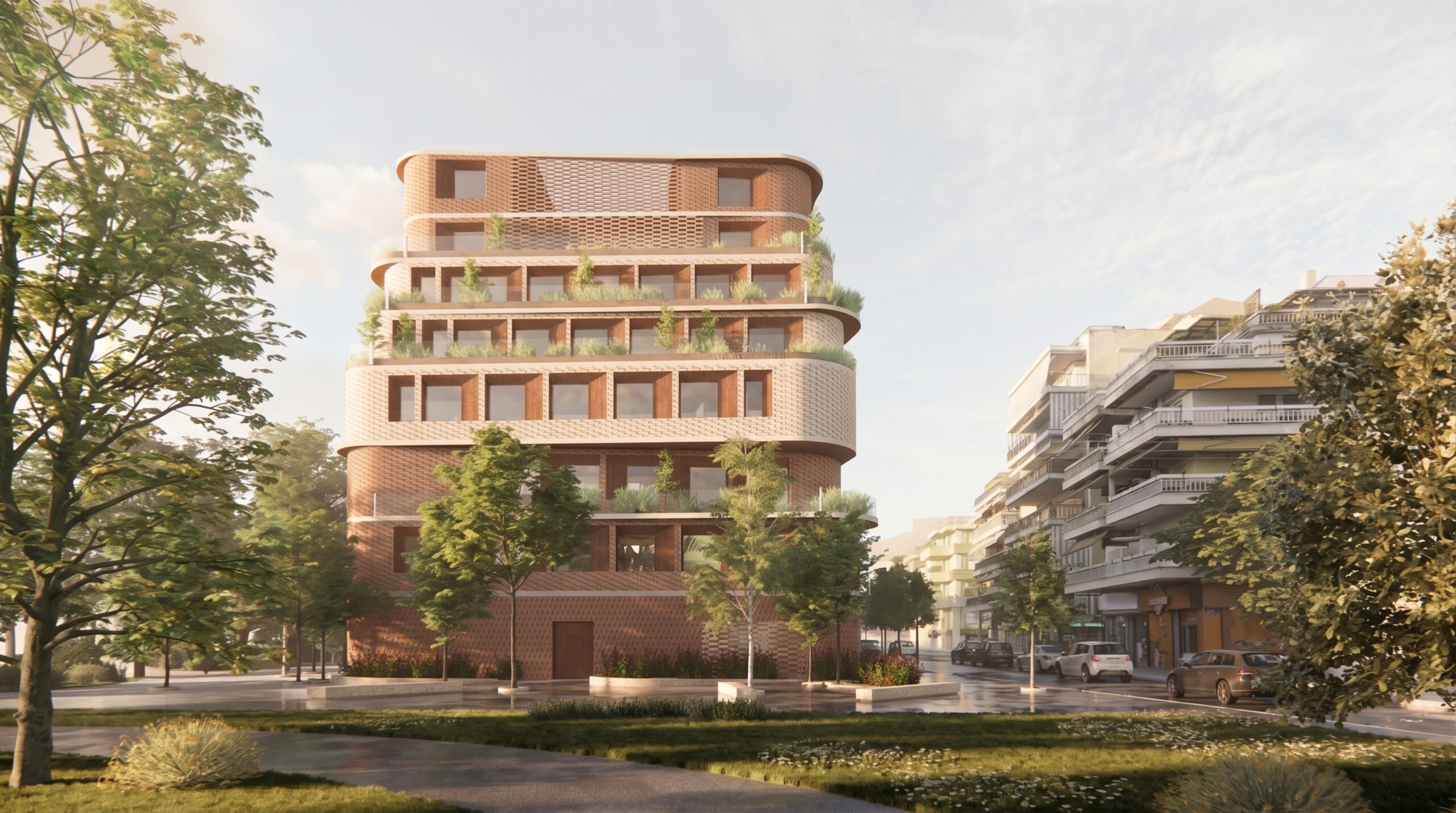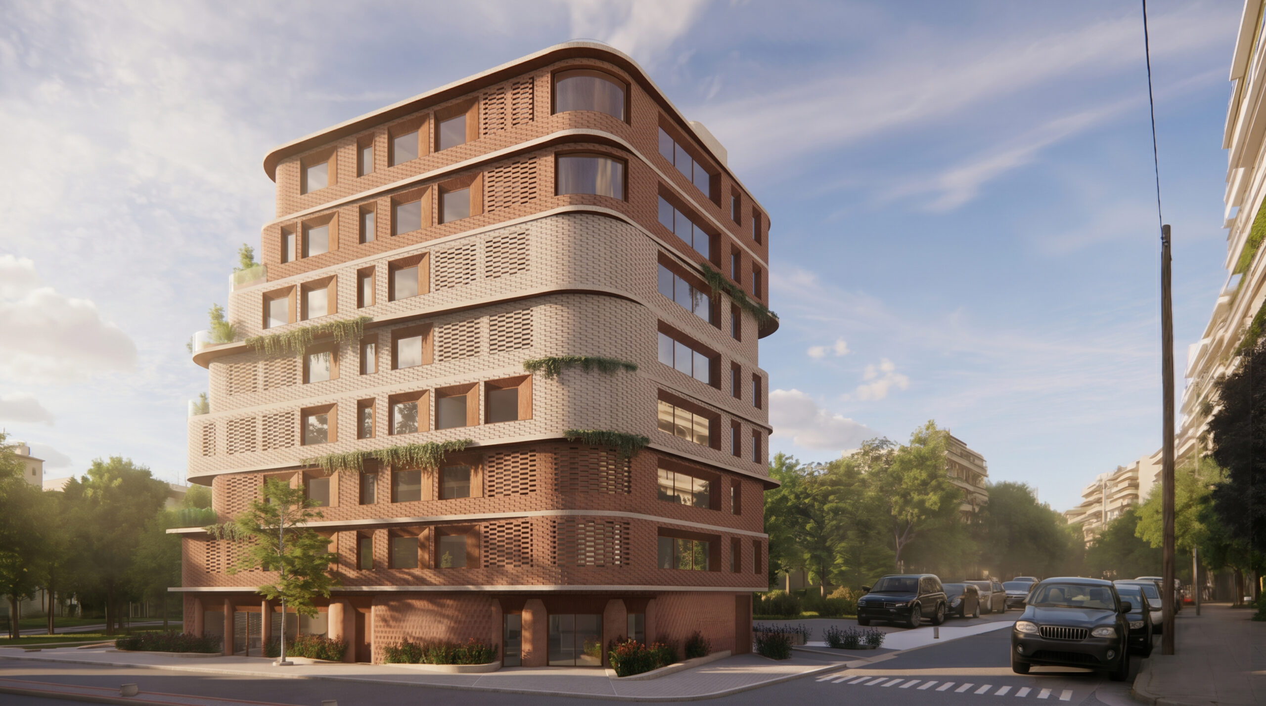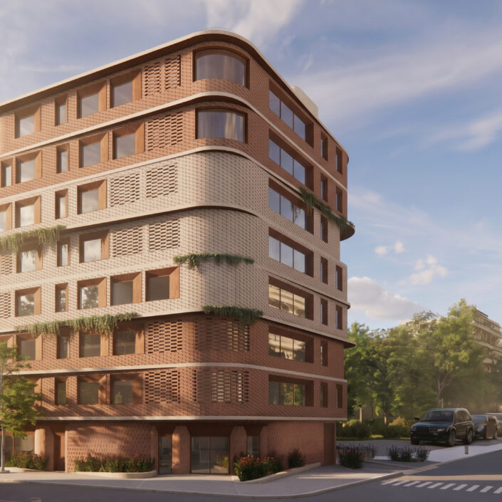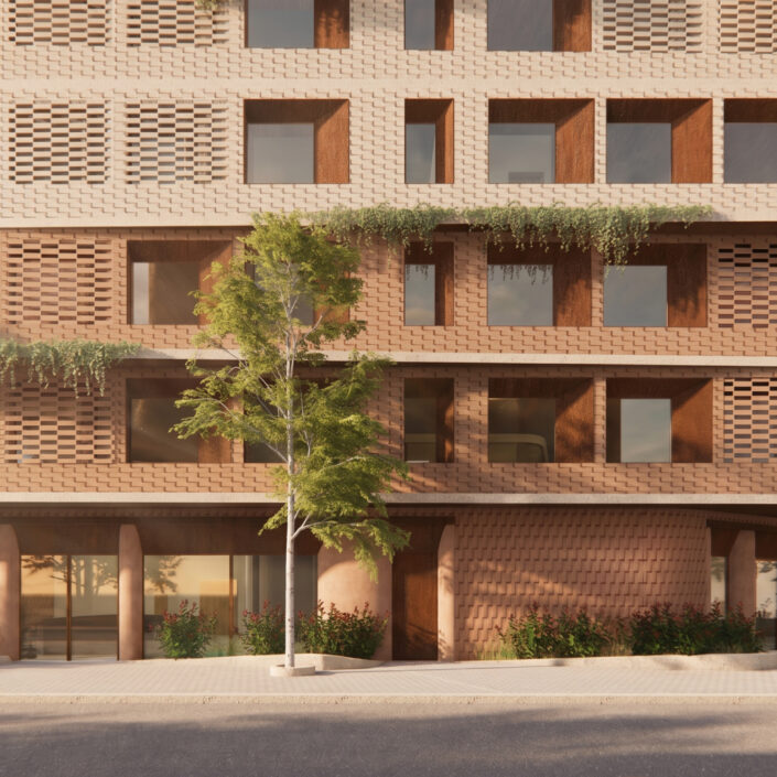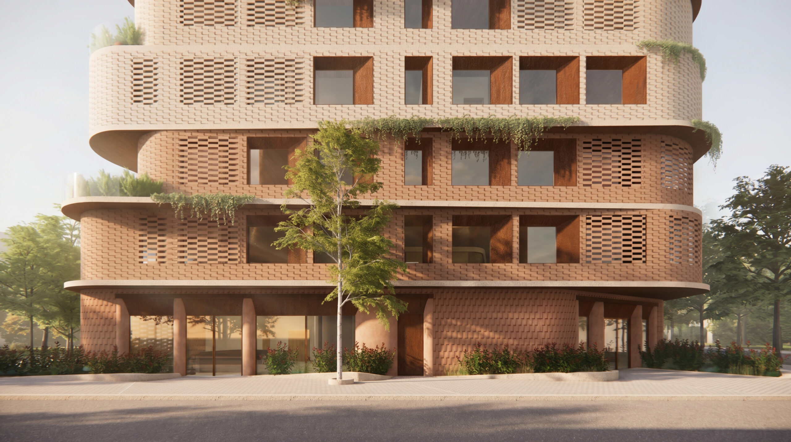 The façades are articulated through earthy materials, such as brick and oxidized steel, and incorporate perforated shading elements, giving the building a contemporary yet timeless character.