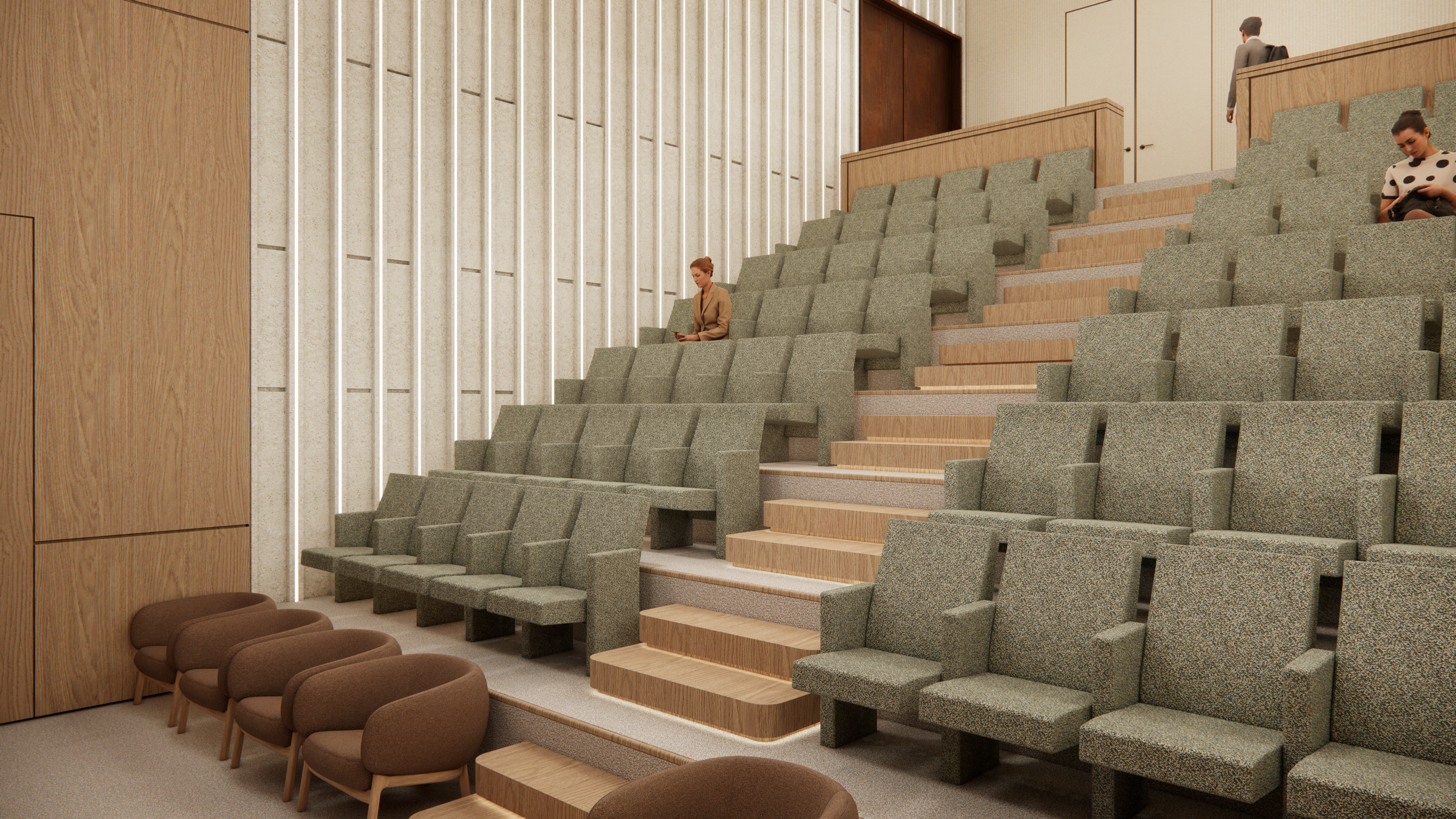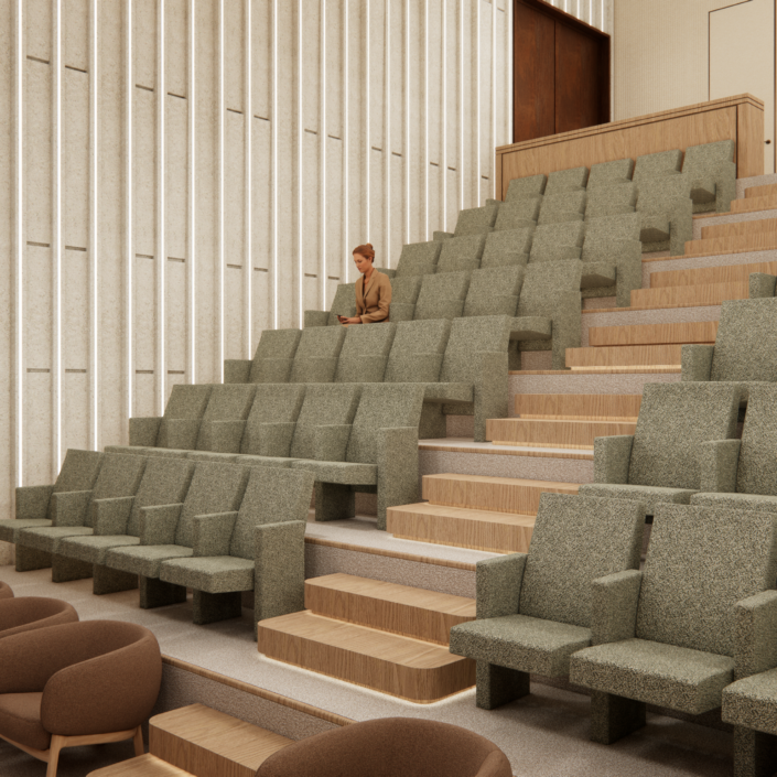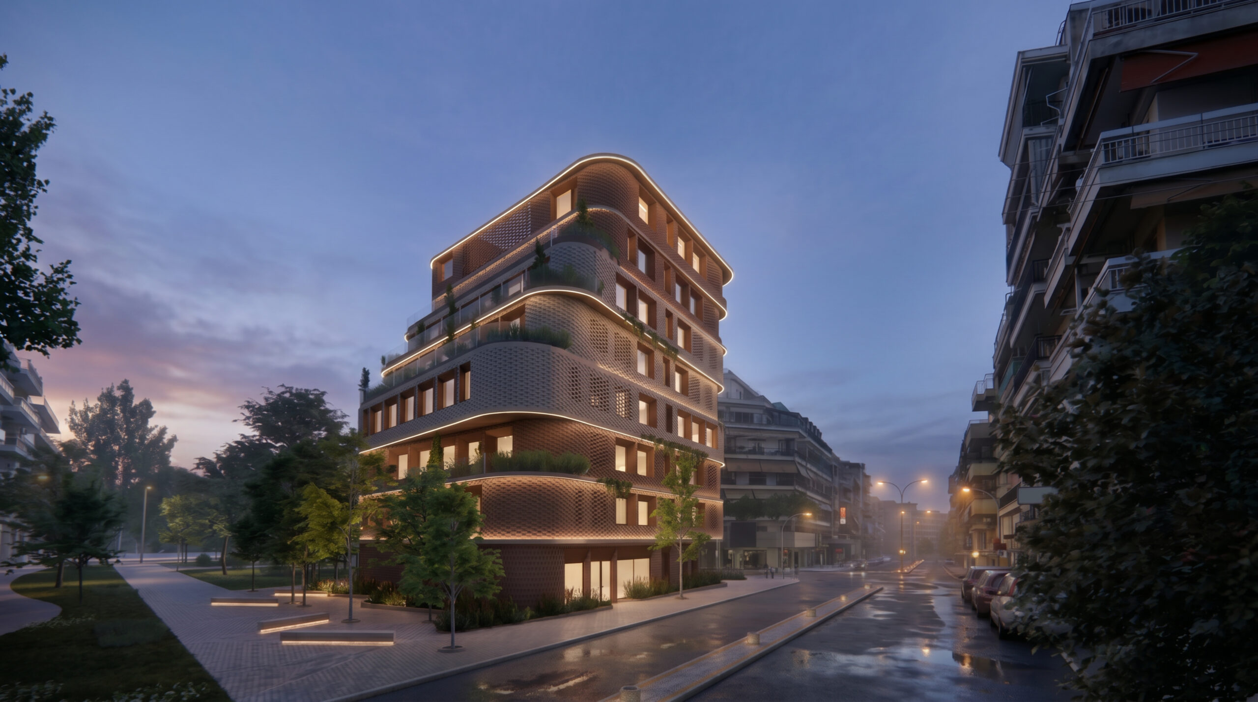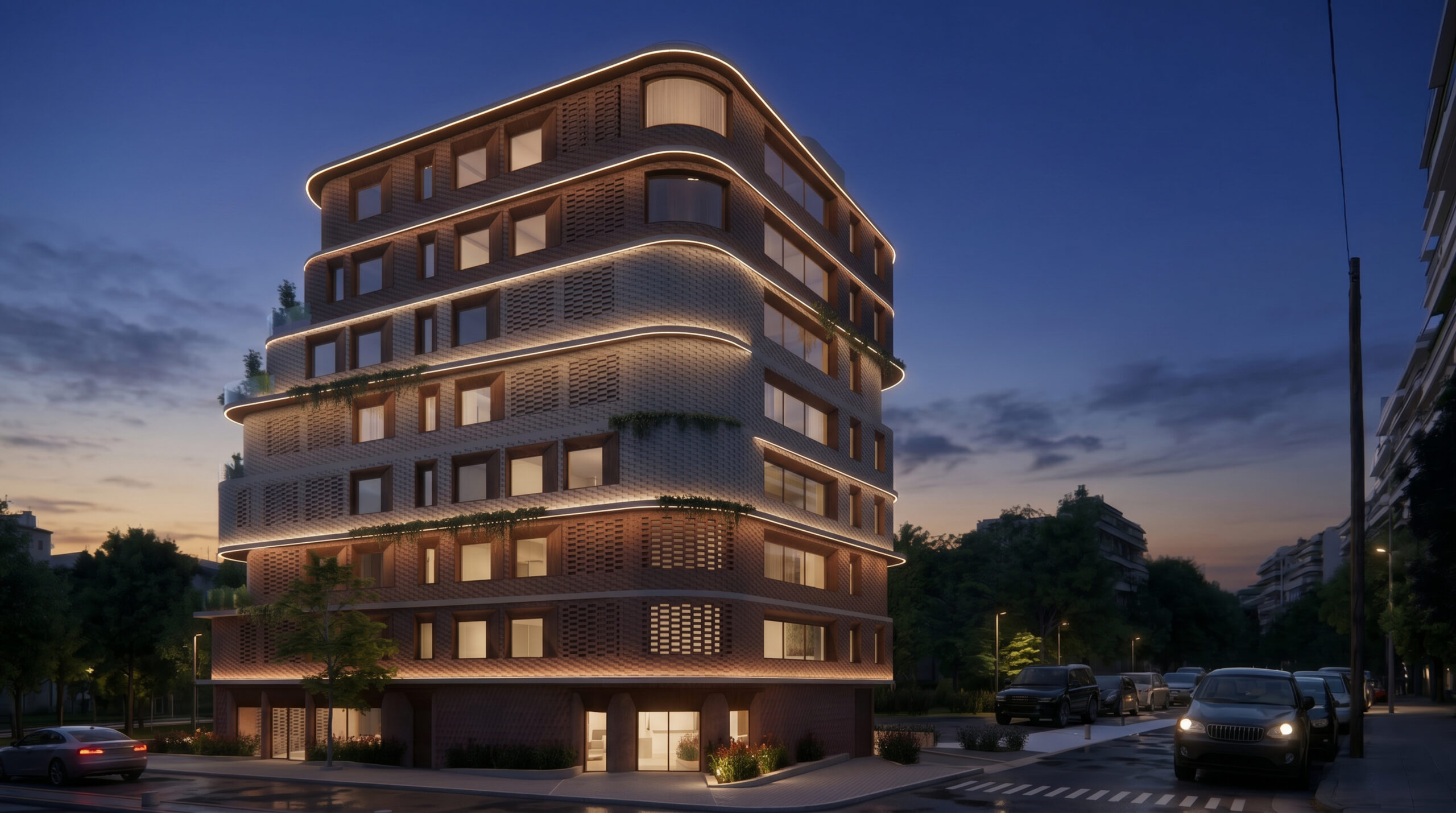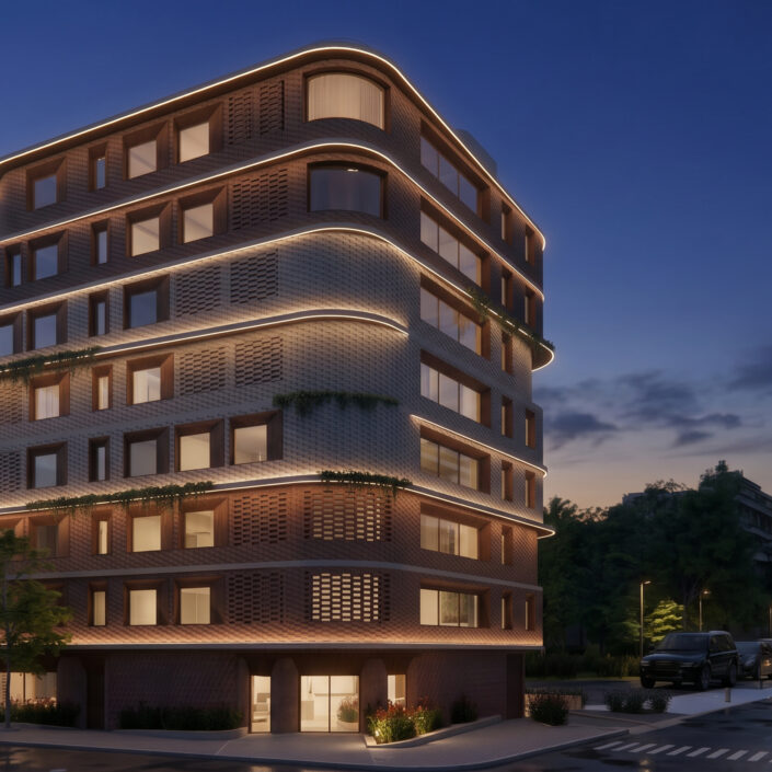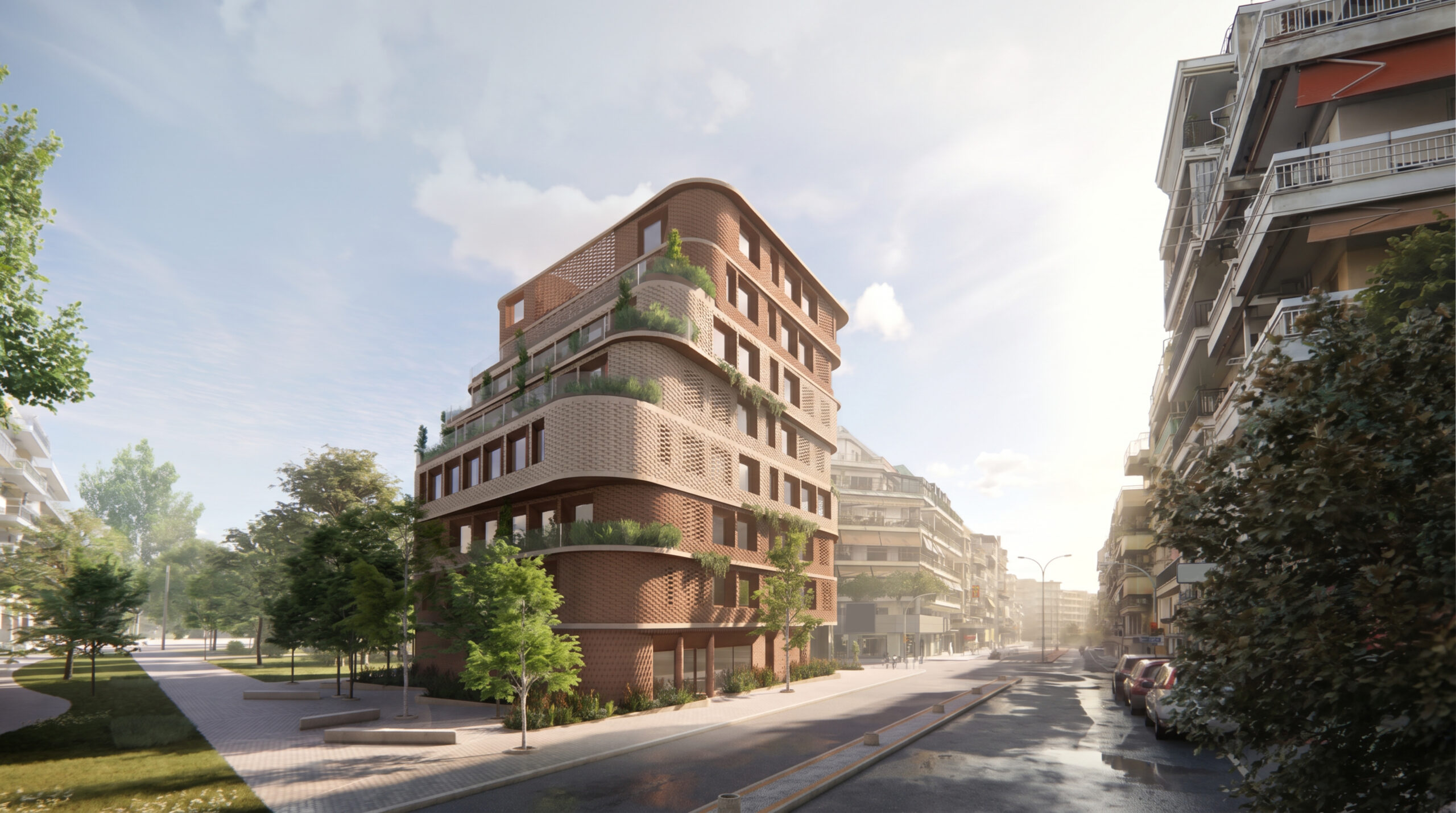 The façades are articulated through earthy materials, such as brick and oxidized steel, and incorporate perforated shading elements, giving the building a contemporary yet timeless character.