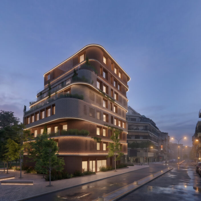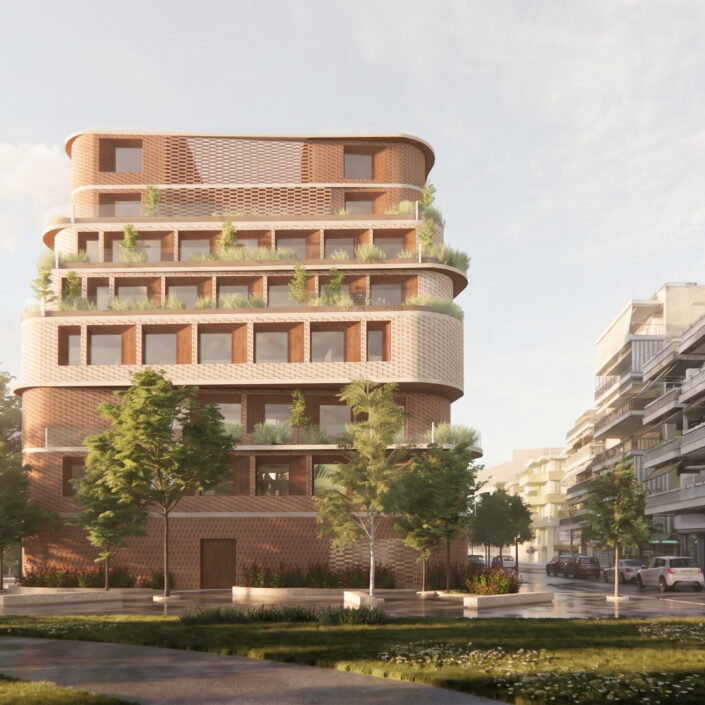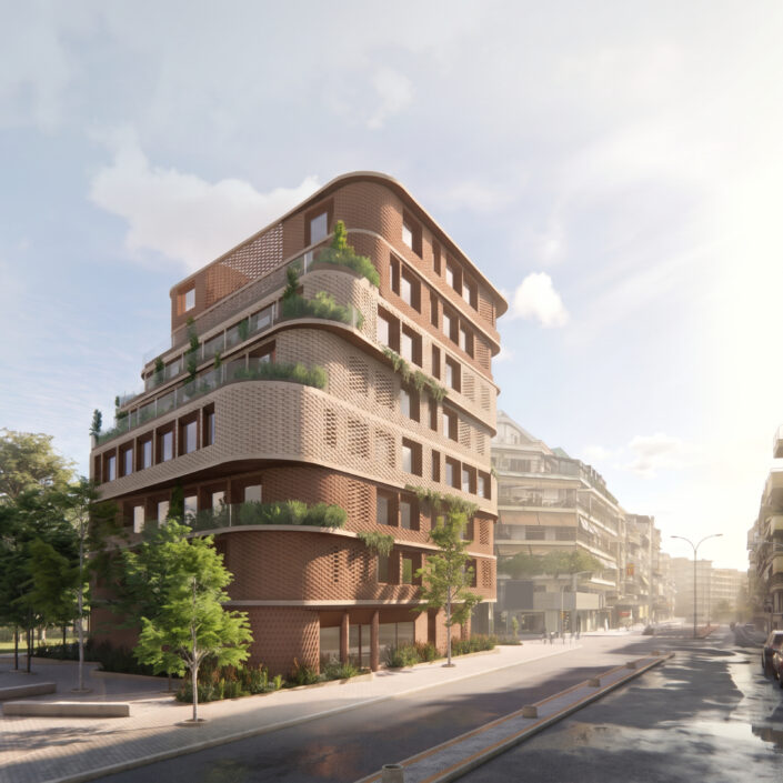 The architectural proposal concerns the development of a contemporary office building, aiming to upgrade the working environment and enhance the overall urban character of the area. The building is organized vertically around a central atrium, which functions as a core of natural light, greenery and social interaction. This vertical development is based on a spiral gesture, where each floor slightly rotates in relation to the one below. At the same time, curved projections are formed, contributing to shading and improving the building’s bioclimatic performance.