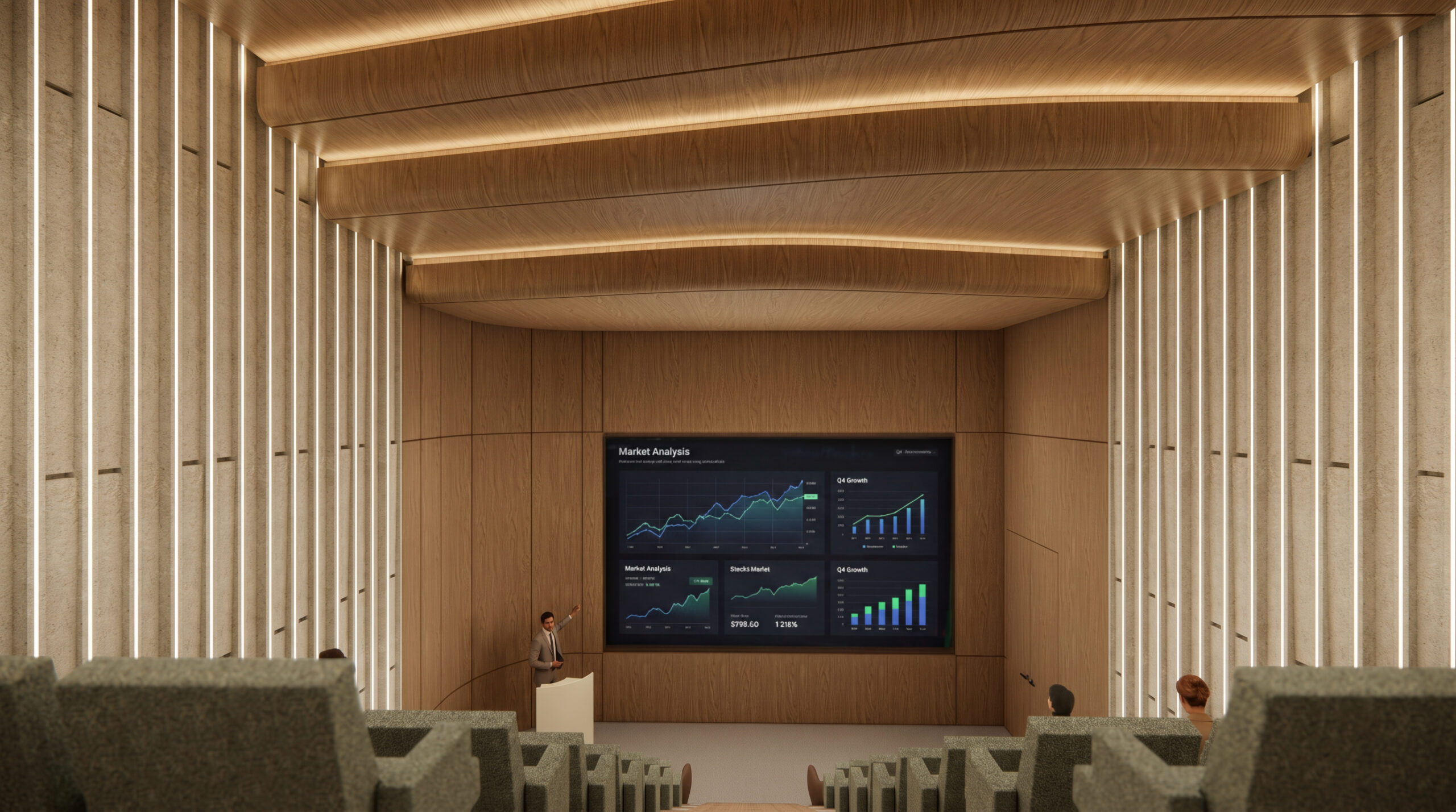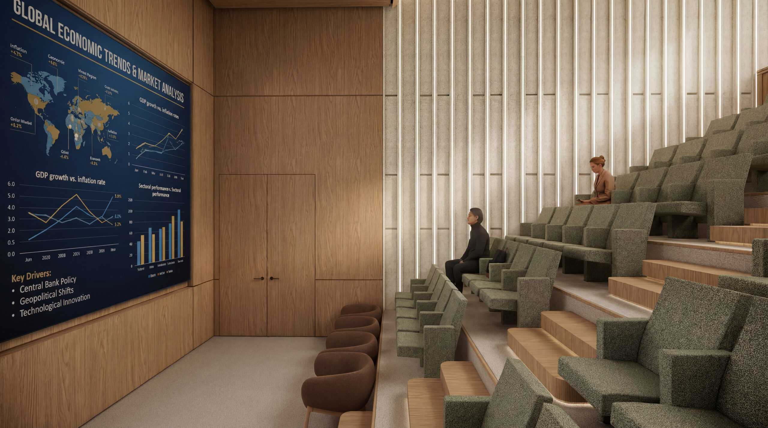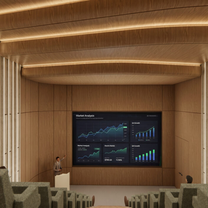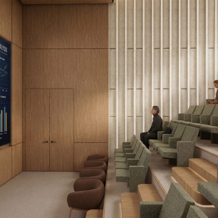 The building program includes a bank branch, reception areas and an auditorium on the ground floor, while the upper levels accommodate flexible workspaces with a combination of open-plan and enclosed offices, collaboration areas and rest spaces. The basement levels provide parking and support functions.